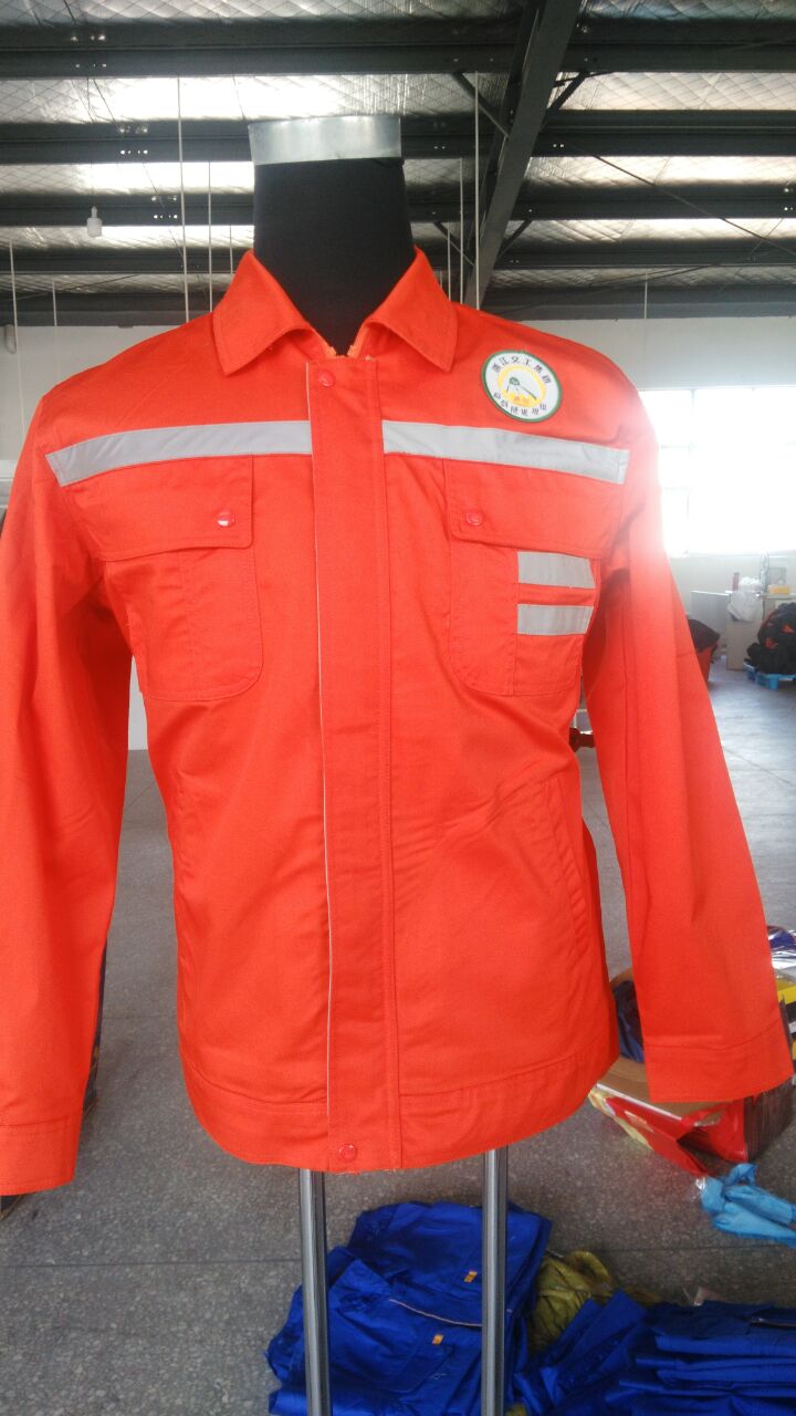 工作服劳保的主色采用的是橘黄色的,因为是隧道施工企业,所以对工作服的耐磨的要求比较高,于是选择的是高棉的环保材质的,左胸缝制上交工特有的徽章还有左臂同样也加上了臂章,整款服装的考虑到行业的性质,最贴心的设计就是在上衣的前后以及裤子的下摆处加上了反光条,多处反光条能够提高员工施工的安全系数。后背白色印刷的内容同样彰显了浙江交工的苏州鹰诺服装。